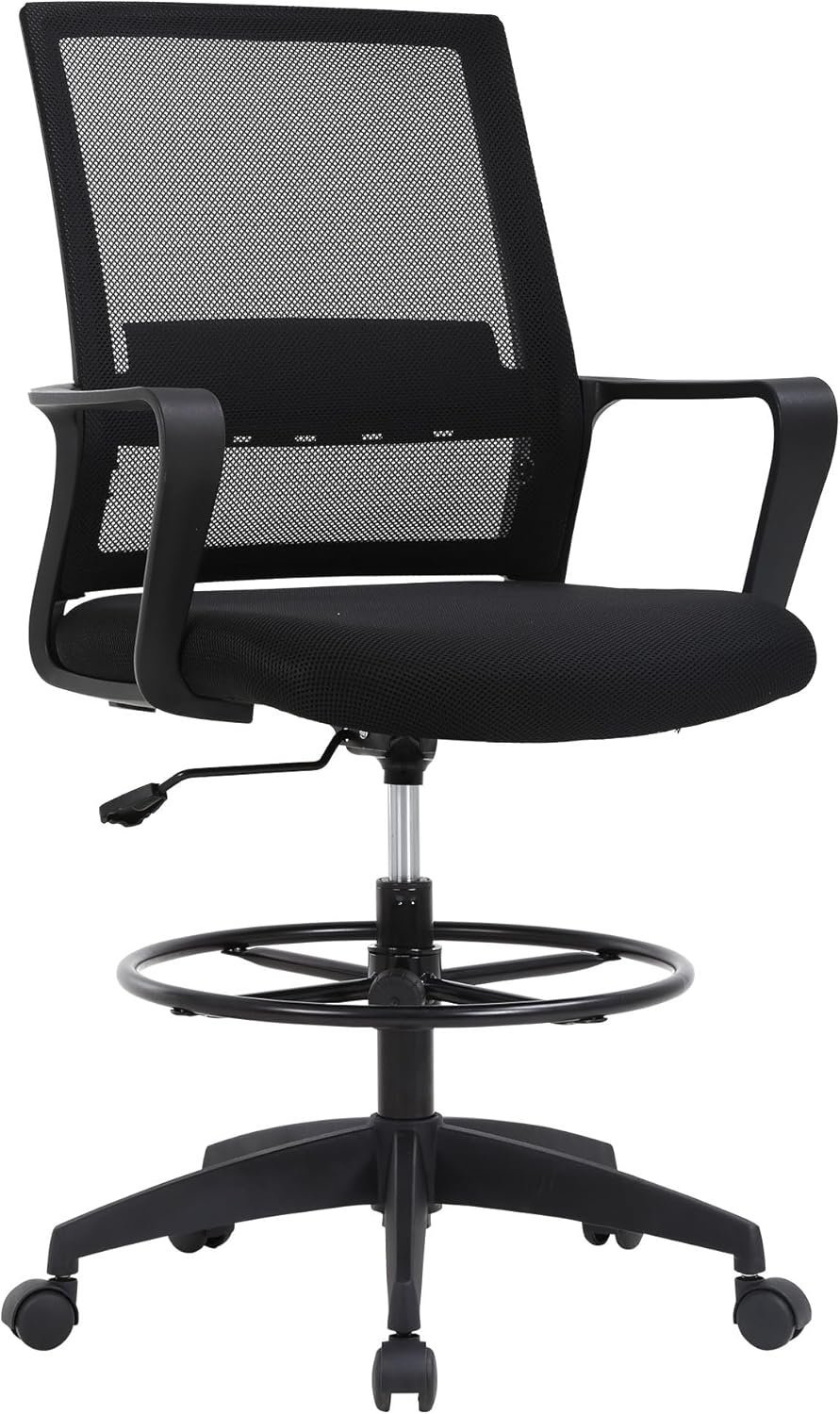 The BestOffice Drafting Chair is a tall, ergonomic office chair designed for comfort and support, featuring breathable mesh, lumbar support, and a convenient footrest. Its adjustable height and 360-degree swivel make it perfect for standing desks and creative workspaces, while smooth-rolling casters offer great mobility. Easy to assemble in minutes, this sturdy chair from BestOffice is ideal for adults seeking comfort and versatility in their workspace.